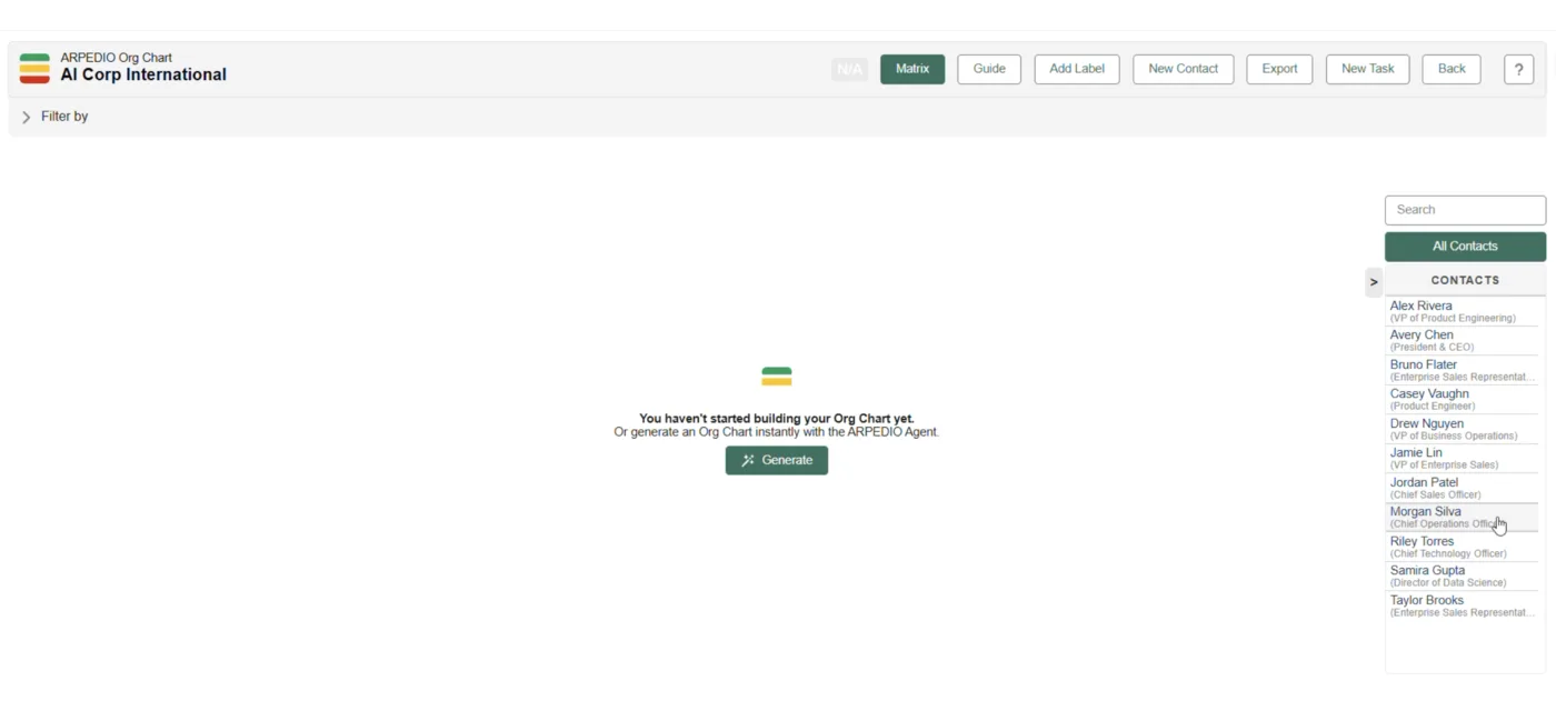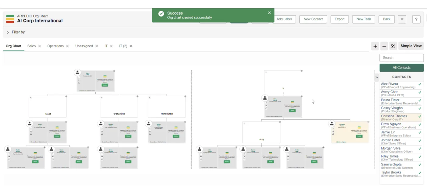 ARPEDIO's AI Agents don't just display stakeholder data. They create it. Auto-generated org charts, sentiment-based relationship scoring, and next-best-action recommendations — built on Salesforce Agentforce architecture.